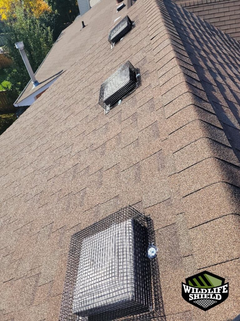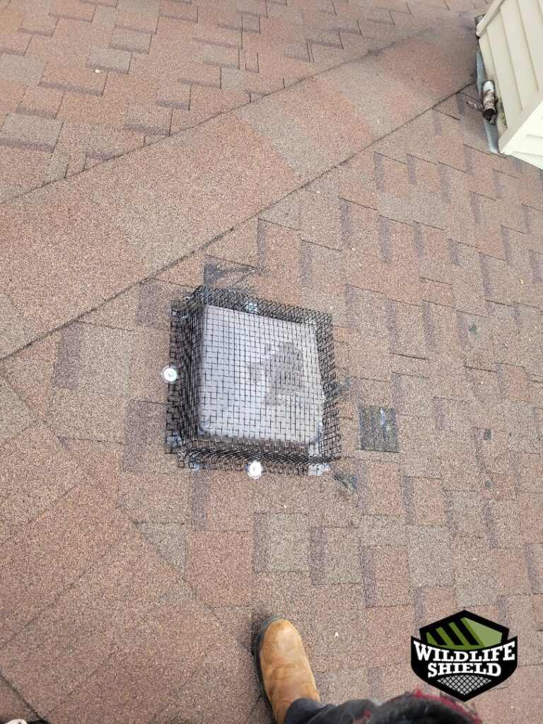Following successful exit activity, exclusion work was completed across the roofline. Approximately fifteen feet of galvanized steel mesh was installed along the drip edge to close gaps. Five plastic roof vents were reinforced with galvanized steel vent cages. Additional screening was installed at soffit areas where accessible, based on inspection findings.