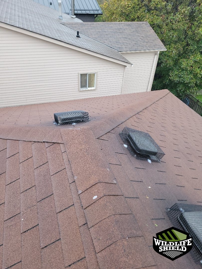 During the initial visit, our technician Grant conducted a full exterior roof inspection. An active entry point was identified at a soffit opening on the underside of the roofline. Additional vulnerable areas were noted, including multiple roof vents and plumbing vent penetrations that could allow wildlife access if left unprotected.
