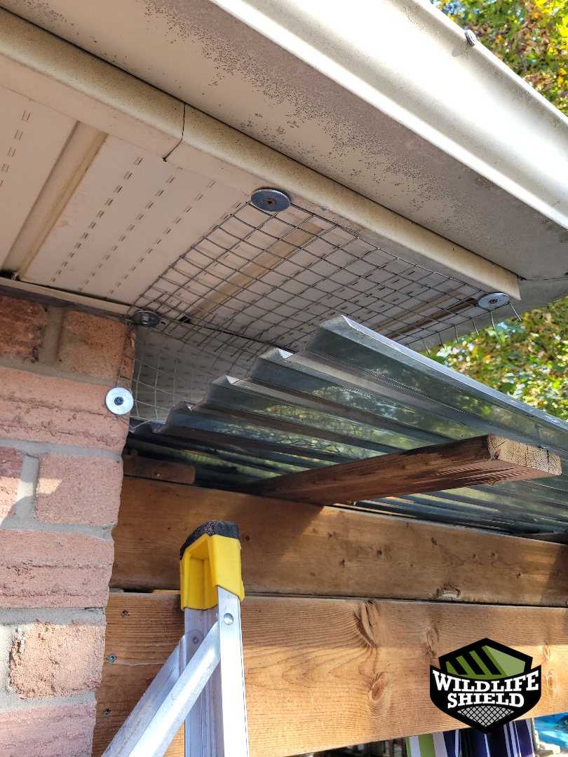 Following successful exit activity, exclusion work was completed across the roofline. Approximately fifteen feet of galvanized steel mesh was installed along the drip edge to close gaps. Five plastic roof vents were reinforced with galvanized steel vent cages. Additional screening was installed at soffit areas where accessible, based on inspection findings.