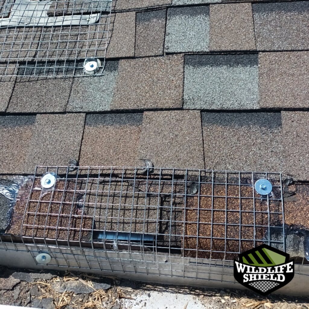 Following installation of the one-way door, approximately twelve feet of galvanized steel mesh was installed along the drip edge to permanently seal the opening. Six plastic roof vents were secured with galvanized steel vent cages, and the bases of two plumbing vents were sealed with galvanized steel mesh.