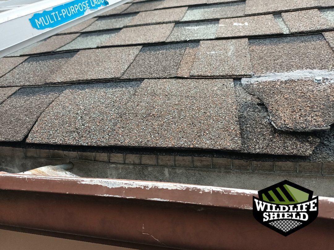 On a subsequent visit, no new entry points were observed; however, damaged shingles were noted in one section of the roof, consistent with external wildlife interference.