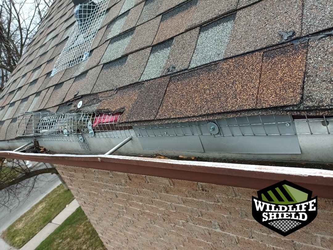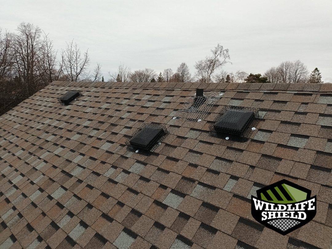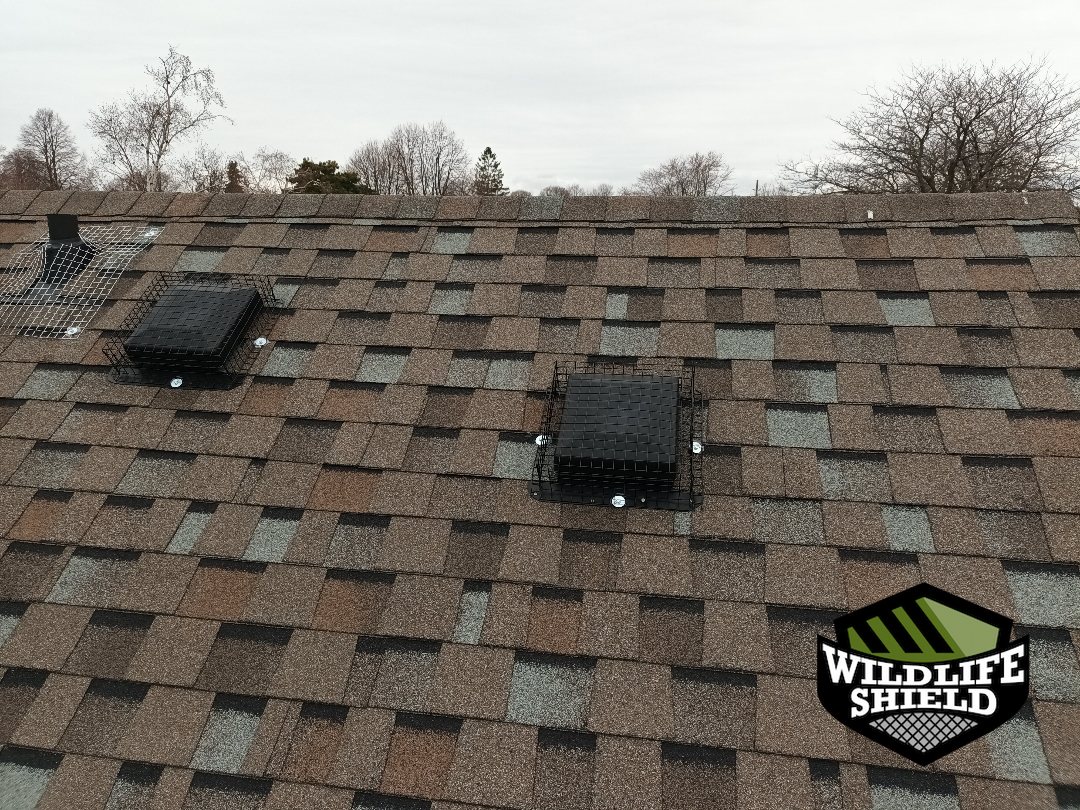 Following installation of the one-way door, approximately twelve feet of galvanized steel mesh was installed along the drip edge to permanently seal the opening. Six plastic roof vents were secured with galvanized steel vent cages, and the bases of two plumbing vents were sealed with galvanized steel mesh.