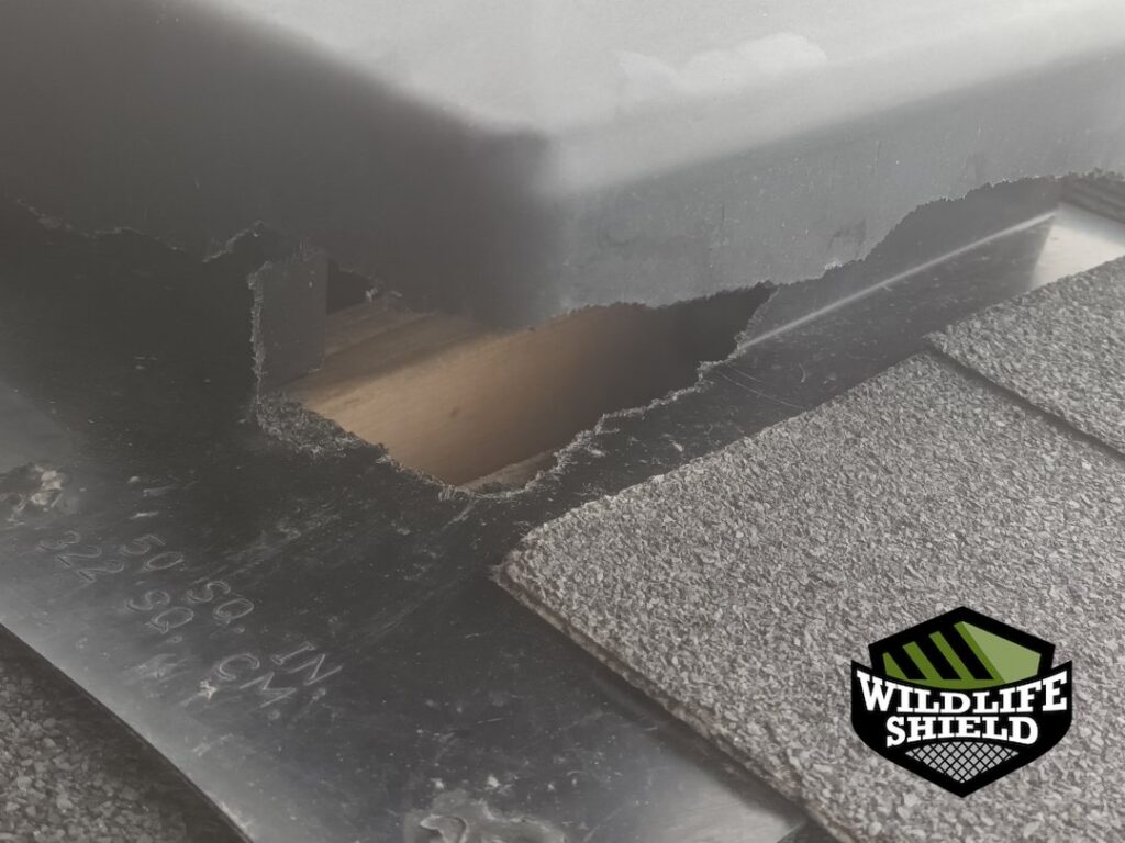 During the initial exterior roof inspection, our technician identified a roof vent that had been heavily chewed through, creating a clear entry point into the attic space. Additional inspection identified a small opening along the soffit area. No interior inspection was required based on confirmed exterior access points and activity patterns.