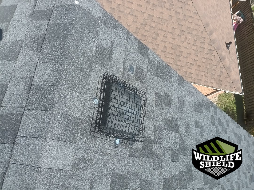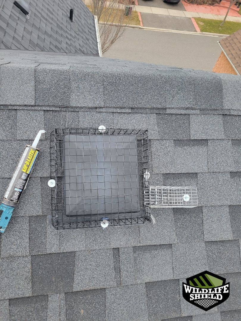 - Squirrel one-way door installed over primary roof vent entry point